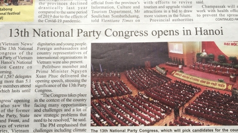(VOVWORLD) -The Pasaxon newspaper, the mouthpiece of the Lao People's Revolutionary Party on Wednesday front-paged an article entitled "The 13th Party Congress of the Communist Party of Vietnam is solemnly inaugurated."