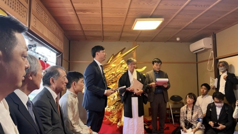 (VOVWORLD) - During a working visit to Kansai TV Station in Japan, VOV’s Vice President Ngo Minh Hien on Wednesday presented a royal dragon-embroidered noren curtain as a gift to the Ofunehoko Conservation Association of Kyoto.
