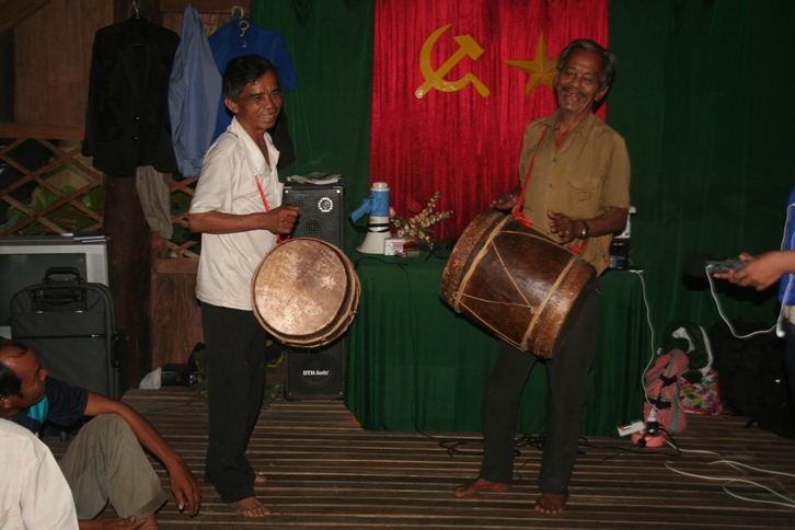 It’s also difficult to make duet drums. There are only two duet drum makers, including Oi Thu in Xuan Lanh commune. This drum, called Chil gul, has a diameter of 27cm and a length of 40cm. Finding the proper wood for the drum making is a challenge. Artist Oi Thu again: “The drum body is made of wood. The drum head is covered with ox-hide or horsehide which is thin and produces echoing sounds. The hide is soaked in water for one night. The two drum heads must produce different sounds: one is low and the other is high pitched”.