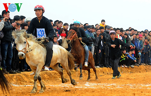 Mong jockeys wear their traditional clothing, plus plastic helmets and canvas shoes. They ride with a bridle but no saddle. 16 horses race in pairs. Sometimes, a nervous horse gallops off the race track as the jockey tries in vain to control it. Some jockeys fall on a sharp turn, making viewers’ hearts miss a beat. Vang Van Quyet and Vang Van Cuong of Na Ang B hamlet, Na Hoi commune, just finished their race. “I’ve been around horses since I was small. I sit firmly on the horseback and try to keep my balance. I understand when the horse is about to turn and do some things to control it.” Quyet said.