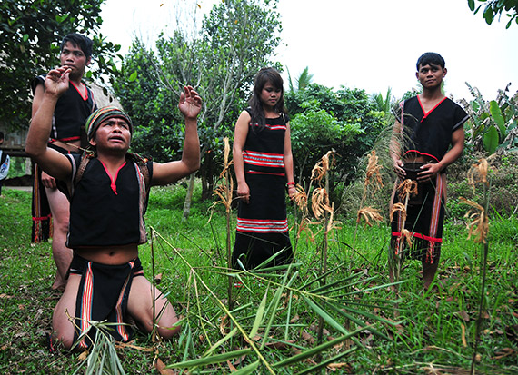 The New Rice celebration takes place over two or three days with many worship rituals and festive activities. From a family ritual in the past, the celebration has now become a community event. A week before the celebration the patriarch gathers all the villagers to inform them of the schedule and assignments for each family. The women will prepare rice, water, and vegetables while the men collect wood, hunt animals, and repair the Rong communal house.
