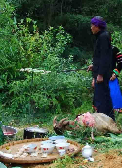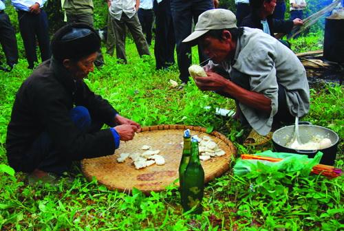 The worship of the Forest Genie takes place on the 6th day of the 6th lunar month. Each household prepares its own offerings. Trang Min Diu, a Pu Peo man who lives in Sung Chang commune, Yen Minh district, says: “All households contribute to the offering a goat, some chickens, wine, and rice. Besides all that, we also offer the forest genie what we eat.”