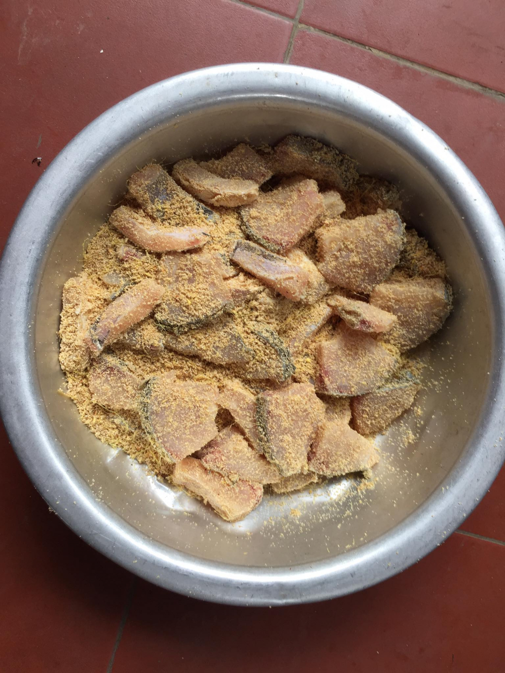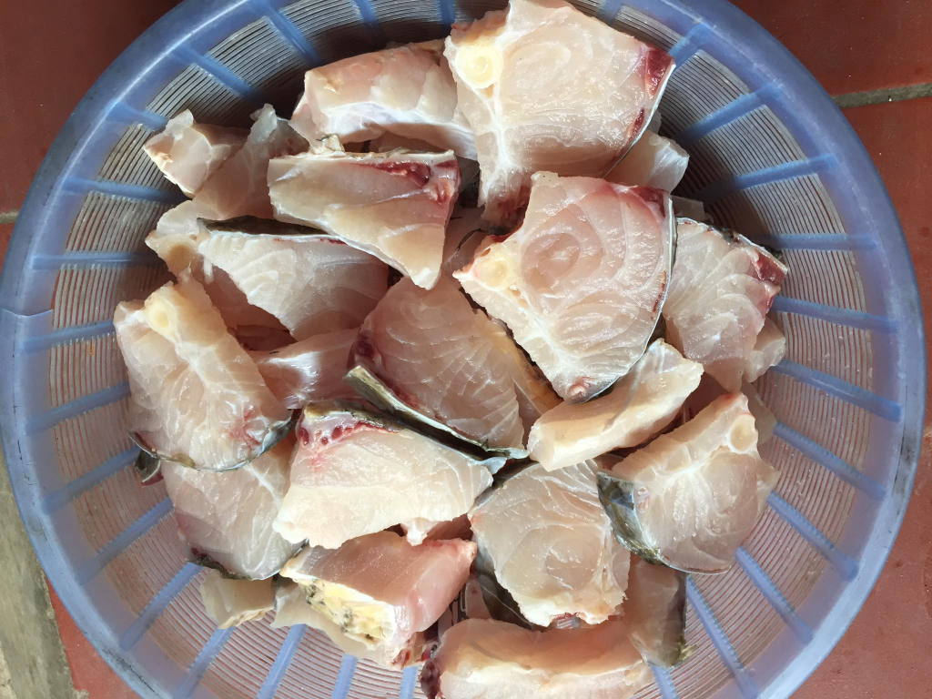 Fish are cleaned well to eliminate the fishy smell, and cut into pieces to blend with finely chopped galangal and garlic, salt, and thinh.