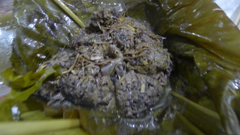 Hang showed us a dish made from duck that looked strange and was an ugly color. But the taste was distinctive: sweet, pungent and greasy: “This dish is called duck simmered with banana inflorescense. It was simmered for some 3 hours over a small fire. The duck is marinated with many ingredients such as chili, ginger, lemon grass, and chicken powder”.