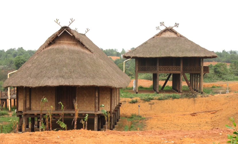 A Thai house on stilts is simple but solid. It is made of bamboo and strong reeds with a thatched roof. Instead of being nailed, the separate parts are joined by tightly knotted bamboo strings. To link pillars, the majority Kinh people use a mortise, but the Thai use ridge beams which go through the pillars. Luong Van Thiet, a researcher with the Vietnam Museum of Ethnology, told VOV: “The black Thai house has a tortoise-shaped roof because people believe a tortoise taught them o build houses. On top of the roof are two crossed bamboo poles, which are called Khau Cut. Khau Cut illustrates the house owner’s social status. A rich owner has lotus-carved poles, while a poor owner has plain pole. The newly-weds have a carved image of an expectant mother to pray for reproduction”.