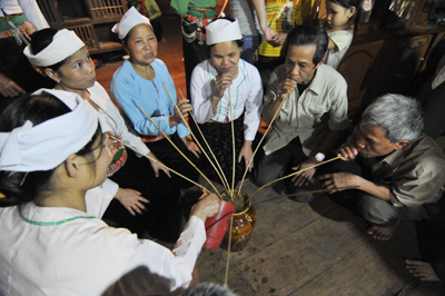 ![]() Drinking "ruou can" is a custom in many ceremonies of the Muong |