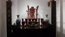 An altar is placed in the main chamber. “This is the altar of the head of a clan. There is a throne, where titles conferred by the king are placed. In the middle is a tray of fruits surrounded by other offerings. The Viet people’s altar always contains 5 elements: metal, wood, water, fire and earth. The incense burner is made of metal, wooden ware represents wood, liquor represents water, candle symbolizes fire, and a pottery vase typifies earth”.