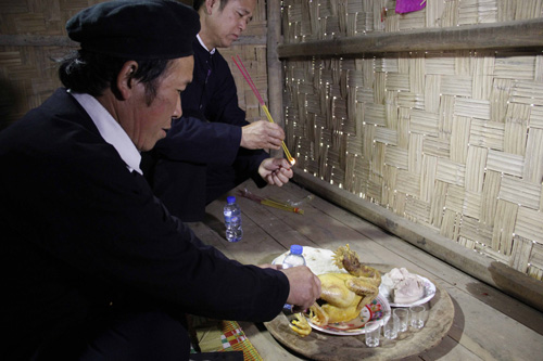 | The bride's family prepares offering to inform their ancestors of the wedding |