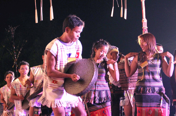 Ma Bio plays a gong with a Chu Ru art troupe. (photo: nhandan.com.vn)