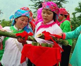 The welcoming-the-bride-home delegation must consist of 2 old couples, who are well-spoken and have happy families, a groomsman, two bridesmaids, a younger brother, who will lead a horse carrying his sister-in-law, and several people carrying presents. Chang again: “The bride’s family will block the gate with a table on which they have placed 8 cups of alcohol. When the groom’s family arrives, they will sing call and response and the groom’s people will drink the alcohol. After that they will be let in. In the past they also put thorny trees or an ant’s nest to block the gate. Now the procedures have been simplified. The groom will give lucky money to the bride’s family before going into the house.”