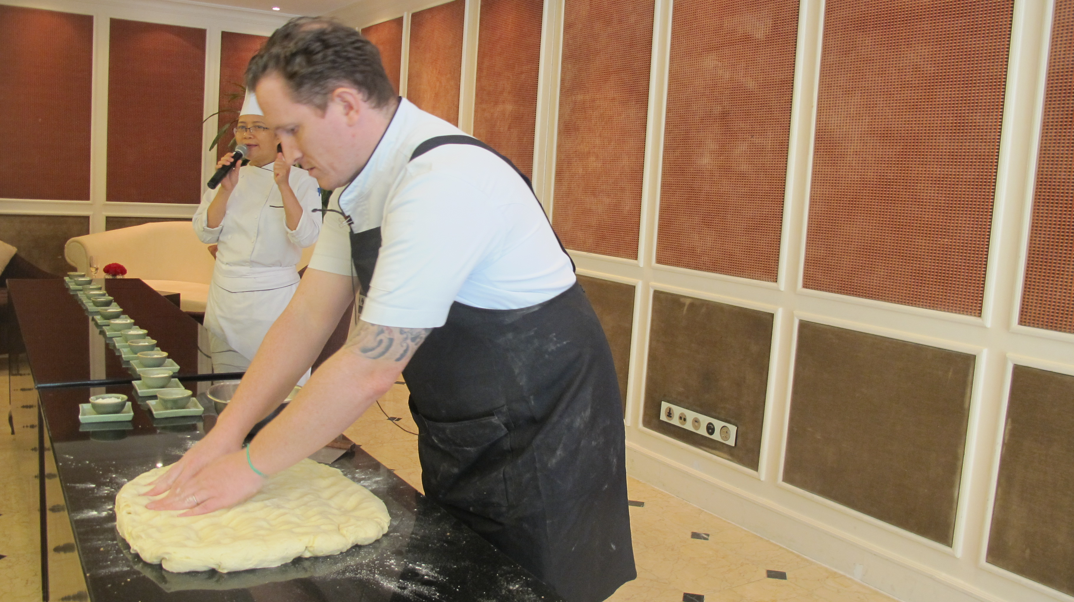 | Chef Christophe Grilo explains how to work with the dough (Photo: VOV /Quynh Hoa) |