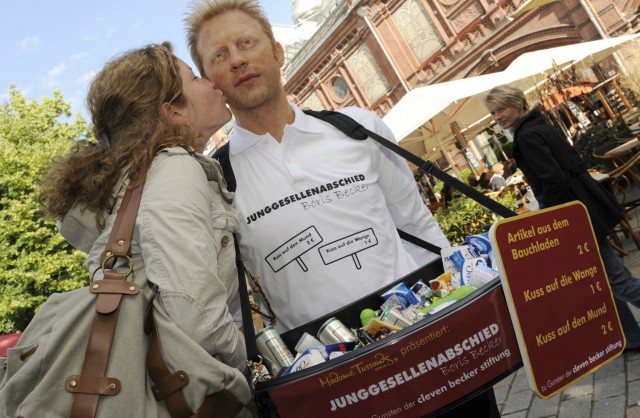 A wax figure of tennis player Boris Becker, representing his own bachelor's party selling goodies (Photo: DPA)