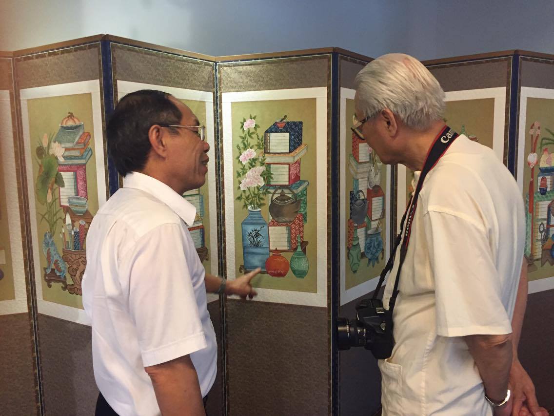 Exhibition goers are admiring a large 8-piece panel-folding scene featuring stationeries, symbolising scholars' dream (Photo: VOV/Duc Hoan)