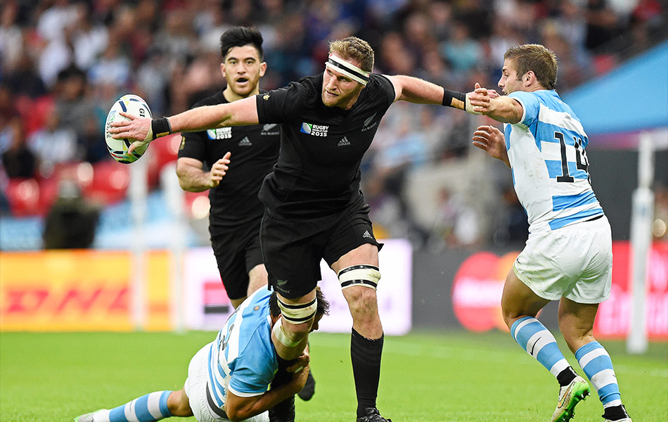 | New Zealand's Brodie Retallick (C) is tackled by Argentina's Santiago Cordero (R) in a match between New Zealand and Argentina at Wembley in London, UK, 20 September 2015 (Photo: EPA) |