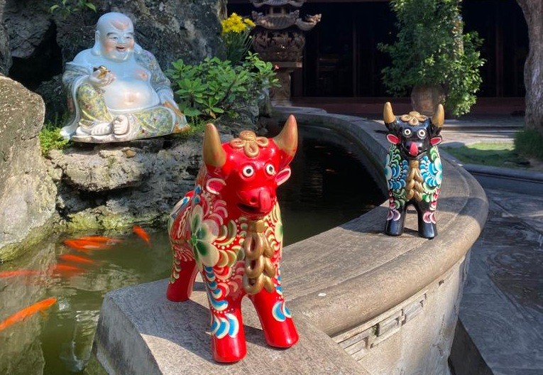 Artist Le Huy told VOV that his co-worker and him created Pucara bull statues using traditional Vietnamese lacquer and stylized adaptations of the cloud and dragon patterns on the stone stairs of Kinh Thien Palace in the Thang Long Imperial Citadel, the motifs on Dong Son bronze drums, and the lotus images that appear in ancient art.