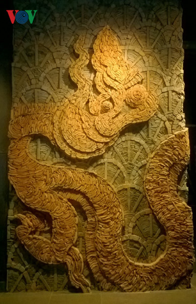 The 2 large-size wall pictures by Bui Thu Trang were made of excavated brick and tile pieces, featuring the construction process of the citadel and the flourishing Dai Viet kingdom. The pictures “Flying dragon” and “Thang Long sunrise” are inspired by the dragon, an emblem of the Ly dynasty, and the lotus patterns of the tiled roofs of the royal palaces.