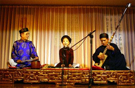 Pulling strings: Old musician Nguyen Van Mui performs with members of his family's Ca Tru Thai Ha Club (Photo: Truong Vi-VNS)