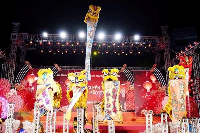 In Ho Chi Minh City, the first Full Moon Festival featured a Vietnamese Poetry Night, the procession of Guan Yu, the auction of lucky lanterns, the Vietnam-Hoa Culinary Festival, and an exhibition of fine art and calligraphic works. A highlight of the festival was a street parade in District 5, with artists in costumes performing dragon dances, lion dances, and circus.