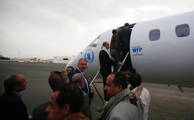 Yemeni political groups, including Shiite rebels known as Houthis, get on an airplane for Geneva for U.N.-led peace talks at the airport in Sanaa, Yemenye, Sunday, June 14, 2015.