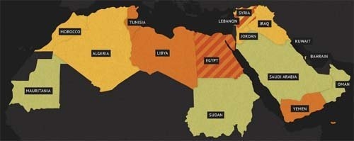 | The map shows instability in the Middle East caused by the Arab Spring revolution. The level of seriousness is on the rise from light to dark yellow. (Photo: RIA) |