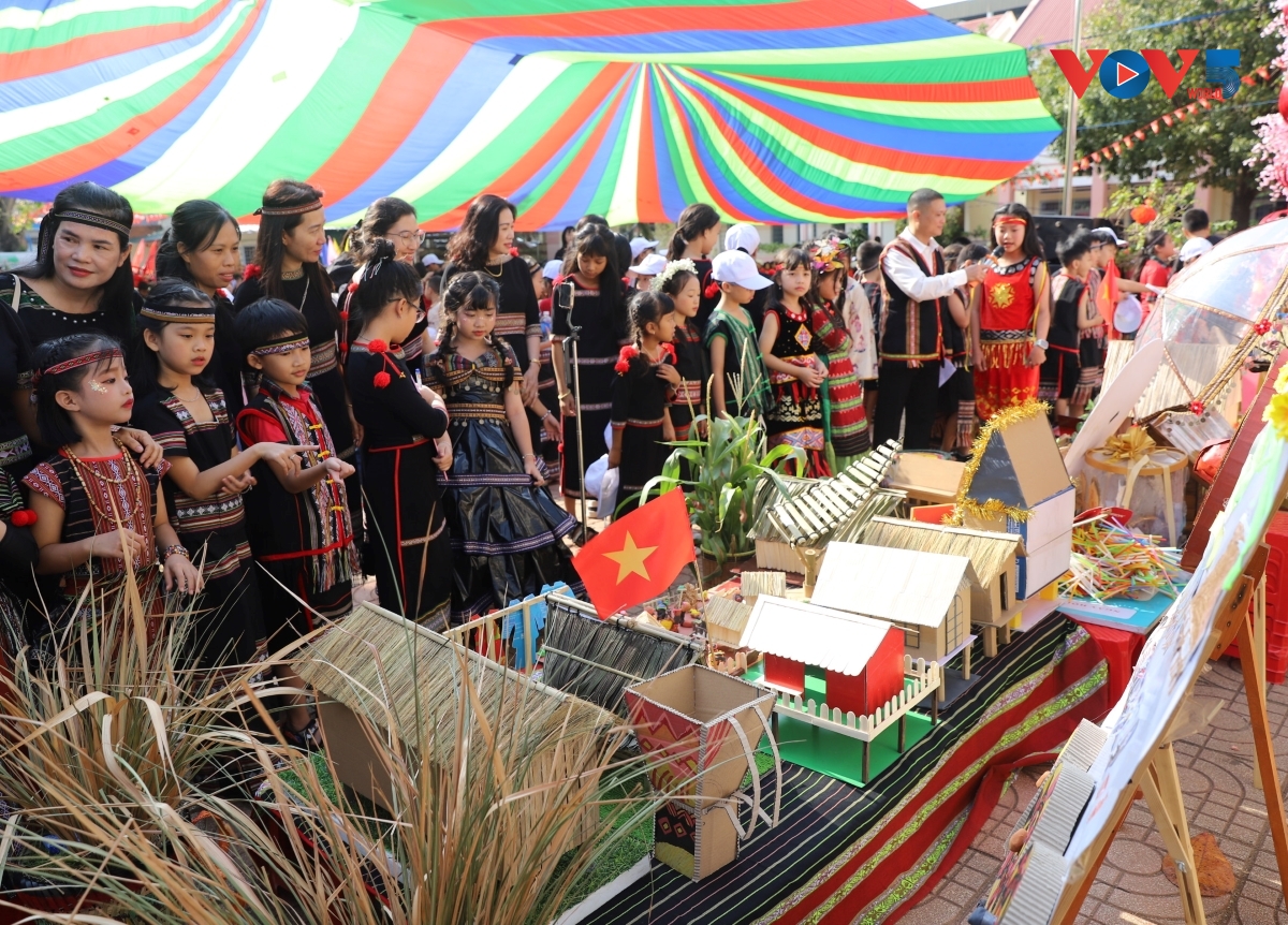 At To Hieu Primary School in Ea Kao ward, students are taking part in building longhouse models, crafting traditional musical instruments, decorating costumes with brocade motifs, and painting village landscapes.
