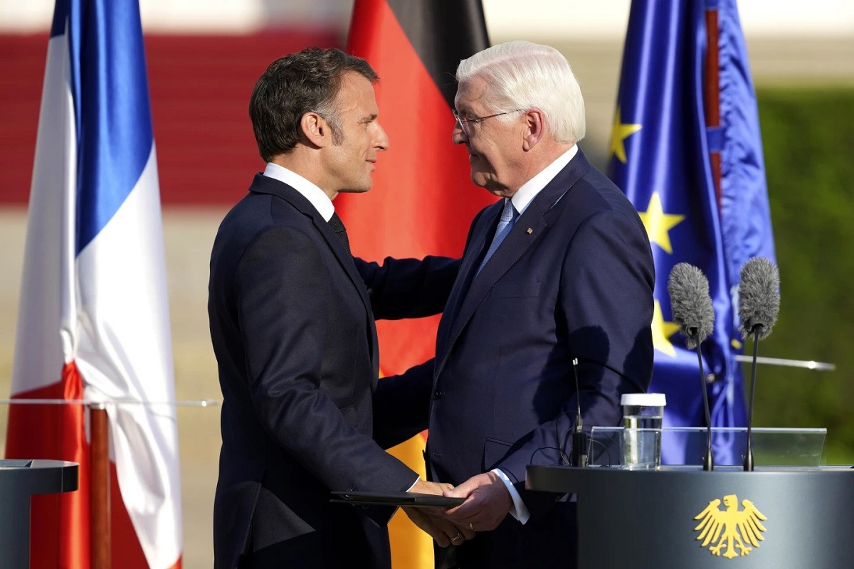 French President Emmanuel Macron and German President Frank-Walter Steinmeier at a press conference in Berlin, Germany, May 26, 2024. (Photo: Markus Schreiber/AP) |