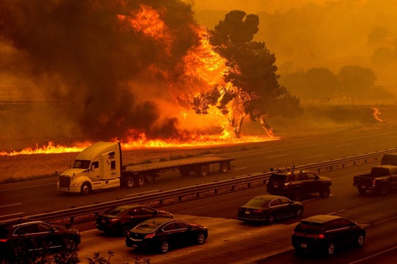 Cars travel near a forest fire in California, the US in August 2020. (photo: Getty images) |