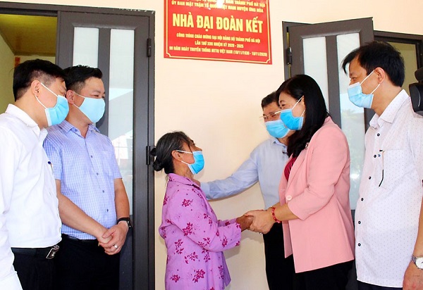 Chairwoman of the Vietnam Fatherland Front's Hanoi affiliate presents a compassion house to Ms Du Thi Phuc in Ung Hoa district (photo: hanoimoi.com.vn) |