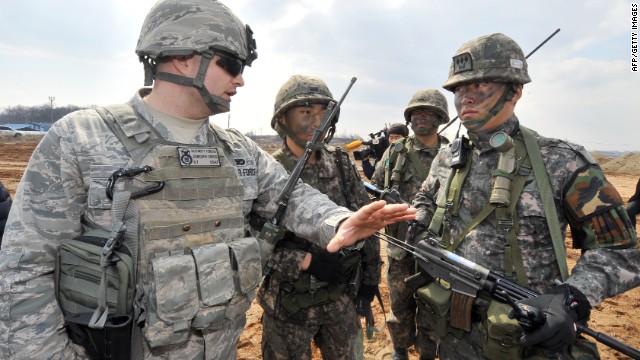 | A US Air Force soldier (L) talks to South Korean soldiers during annual joint exercises south of Seoul, on March 14 |