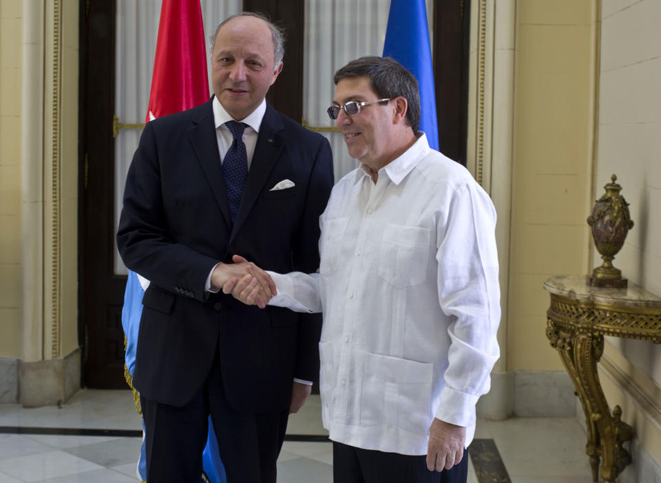 | Cuba's Foreign Minister Bruno Rodriguez (right) and France's Foreign Minister Laurent Fabius shake hands toward photographers prior to their meeting at the Foreign Ministry in Havana, Cuba, Saturday, April 12, 2014. (photo: news.yahoo.com) |