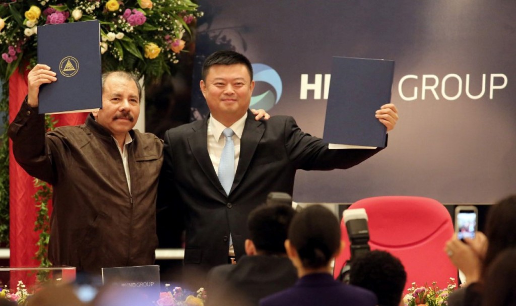 ![]() Nicaraguan President Daniel Ortega and Wang Jing hold the signed documents of the framework agreement for the construction of the Interoceanic Grand Canal. Managua Nicaragua on June 14, 2013. AFP/INTI OCON |