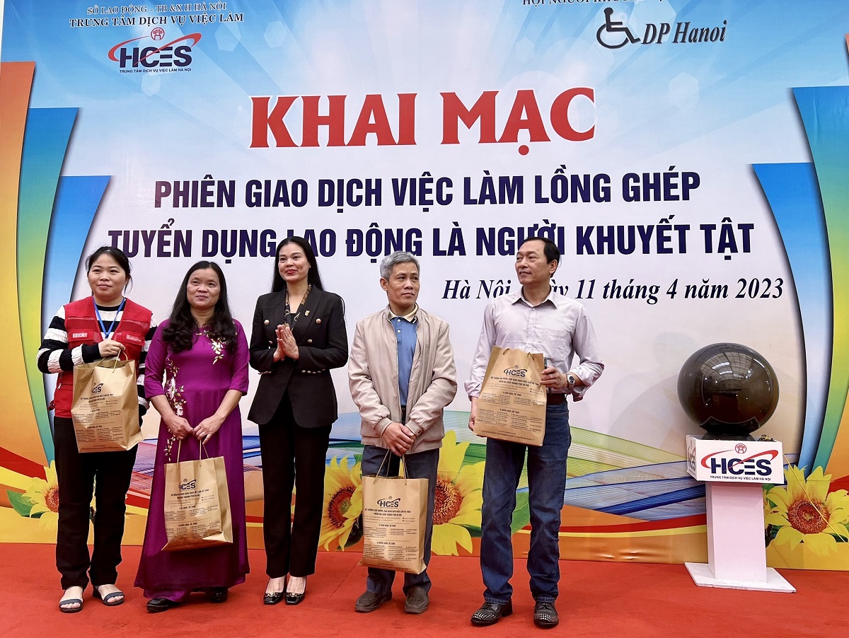 Bach Lien Huong, Director of the Hanoi Department of Labor, Invalids, and Social Affairs, gives gifts to some people with disabilities at the opening ceremony of the recruitment session on April 11, 2023. (Photo: VOV) |