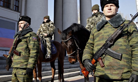 ![]() Rebels stand guard during the inauguration of Alexander Zakharchenko as new PM of the self-proclaimed Donetsk People's Republic. Photograph: Alexander Ermochenko/EPA