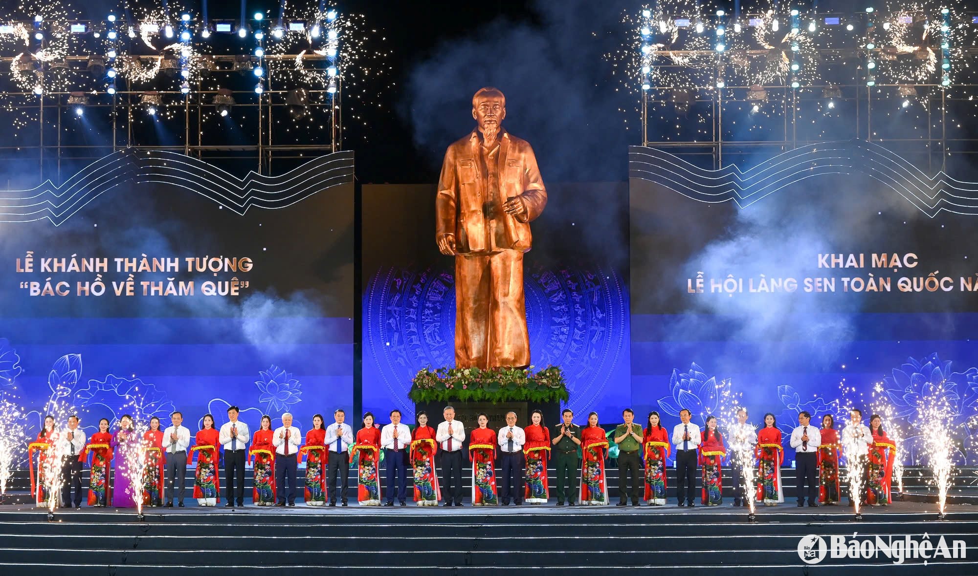 General Secretary To Lam, leaders and former leaders of the Party, State and leaders of Nghe An province cut the ribbon to inaugurate the statue "Uncle Ho visits his hometown". (Photo: Thanh Cuong) |