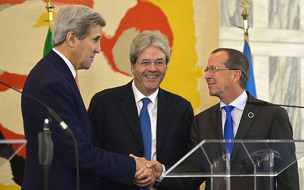 ![]() Italy's Foreign Minister Paolo Gentiloni (C), U.S. Secretary of State John Kerry (L) and UN special envoy for Libya Martin Kobler at a joint news conference following an international conference on Libya at the Ministry of Foreign Affairs in Rome December 13, 2015. REUTERS/Mandel Ngan/Pool