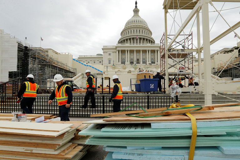| Workers building viewing stands at the Capitol for President-elect Donald Trump’s inauguration. (Source: Jonathan Ernst/Reuters) |