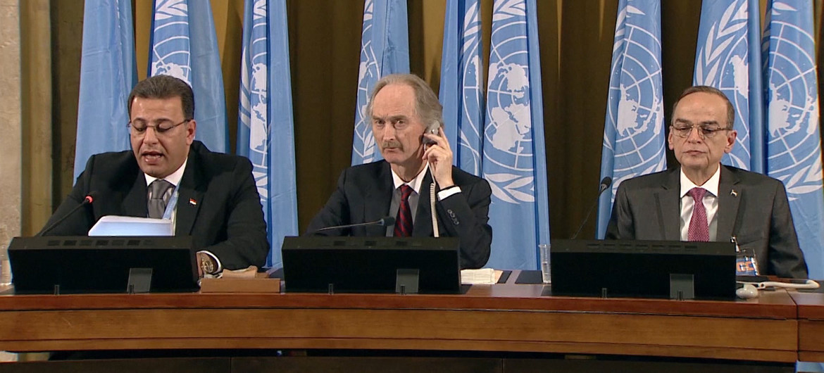 UN Special Envoy for Syria (centre), and Syrian Constitutional Committee Co-Chairs Ahmad Kuzbari from the Government (left) and Hadi Albahra from the Opposition (right) (File photo of Geir O. Pedersen, news.un.org) |