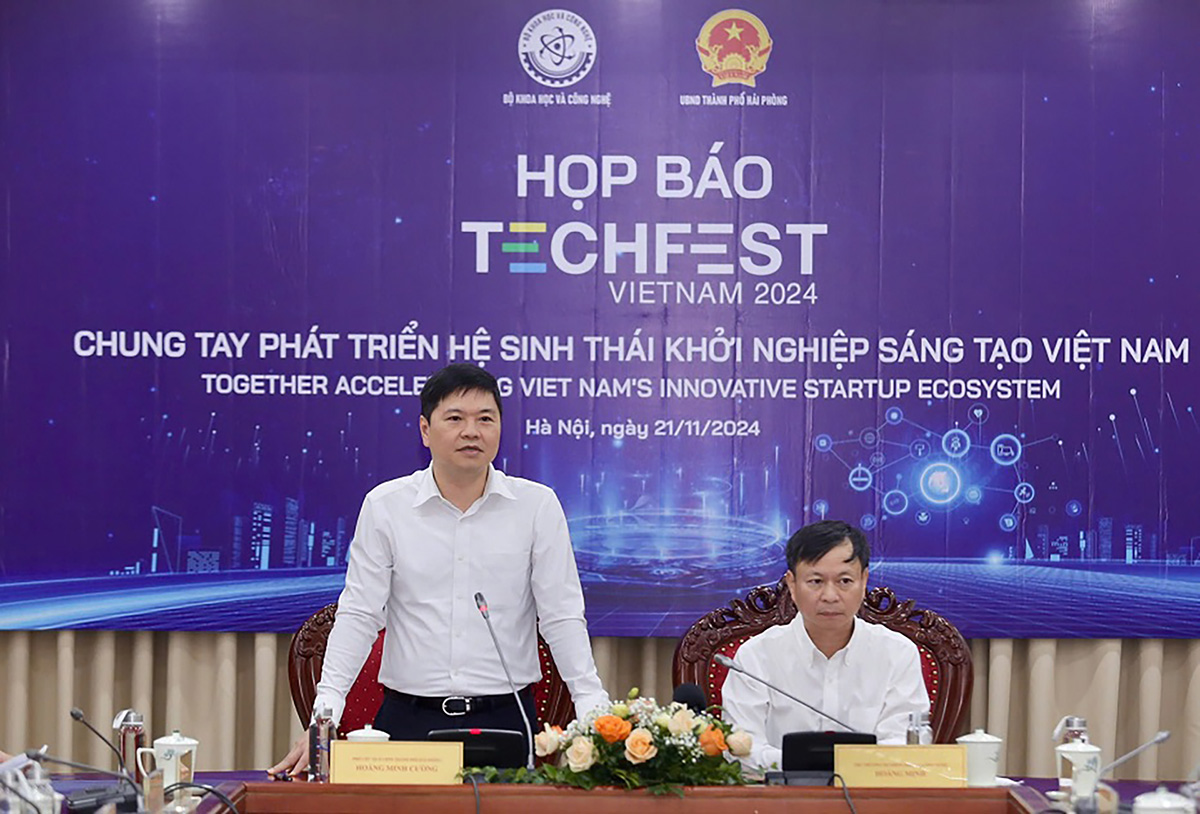 Hoang Minh Cuong, Vice Chairman of Hai Phong city’s People’s Committee, speaks at the press conference on TECHFEST Vietnam 2024. (Photo: most.gov.vn) |