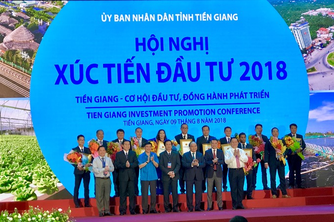 Prime Minister Nguyen Xuan Phuc (3rd right, front row) and leaders of the Tiền Giang Province People’s Committee congratulate investors who received approval to carry out feasibility studies for their projects. (Photo: VNS/Hoang Nguyen) |