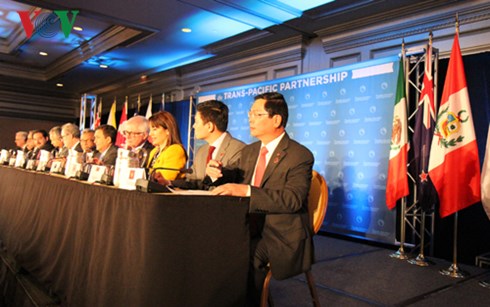 | Vietnamese Trade Minister Vu Huy Hoang and other 11 Trade Ministers at a press conference to announce the conclusion of TPP negotiation in Atlanta, on Oct 5, 2015 |