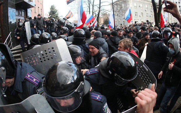 ![]() Riot police stand in front of pro-Russian activists as they storm the prosecutor's office in the eastern Ukrainian city of Donetsk.