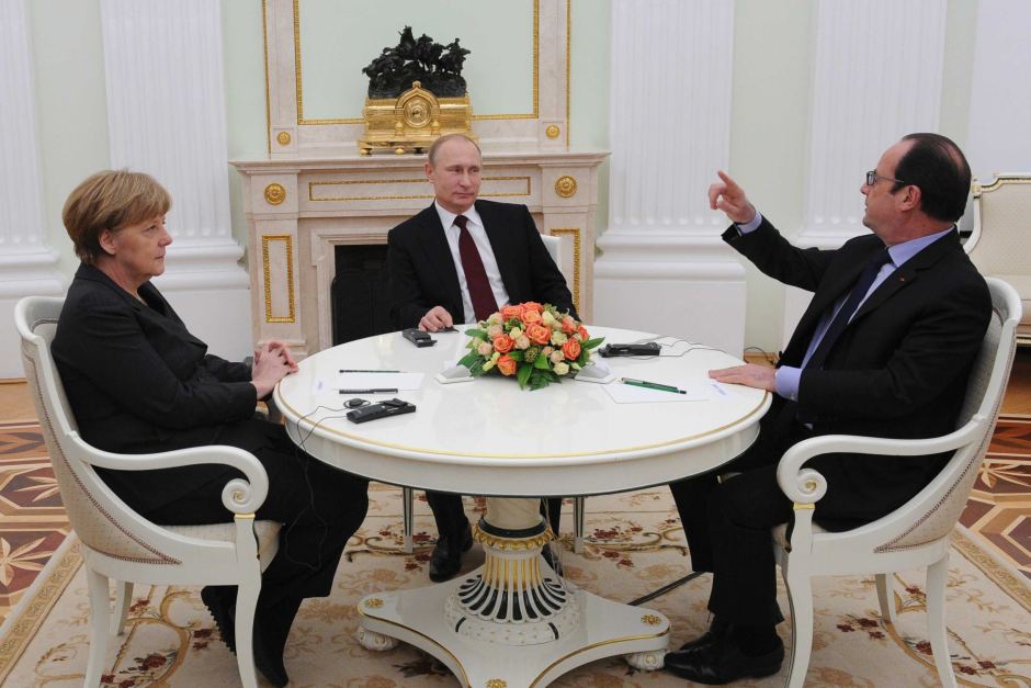 | German Chancellor Angela Merkel, Russian President Vladimir Putin, and French President Francois Hollande meet to talk about the Ukraine crisis. (Photo: Reuters) |