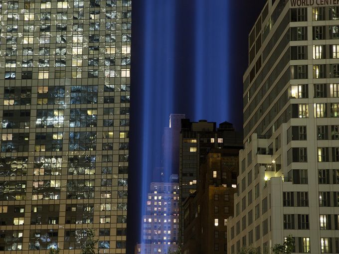 | Twin beams of light flash into the sky from The Tribute in Light display near the World Trade Center complex on Sept. 8 in New York City. (Photo: Mark Lennihan, AP) |