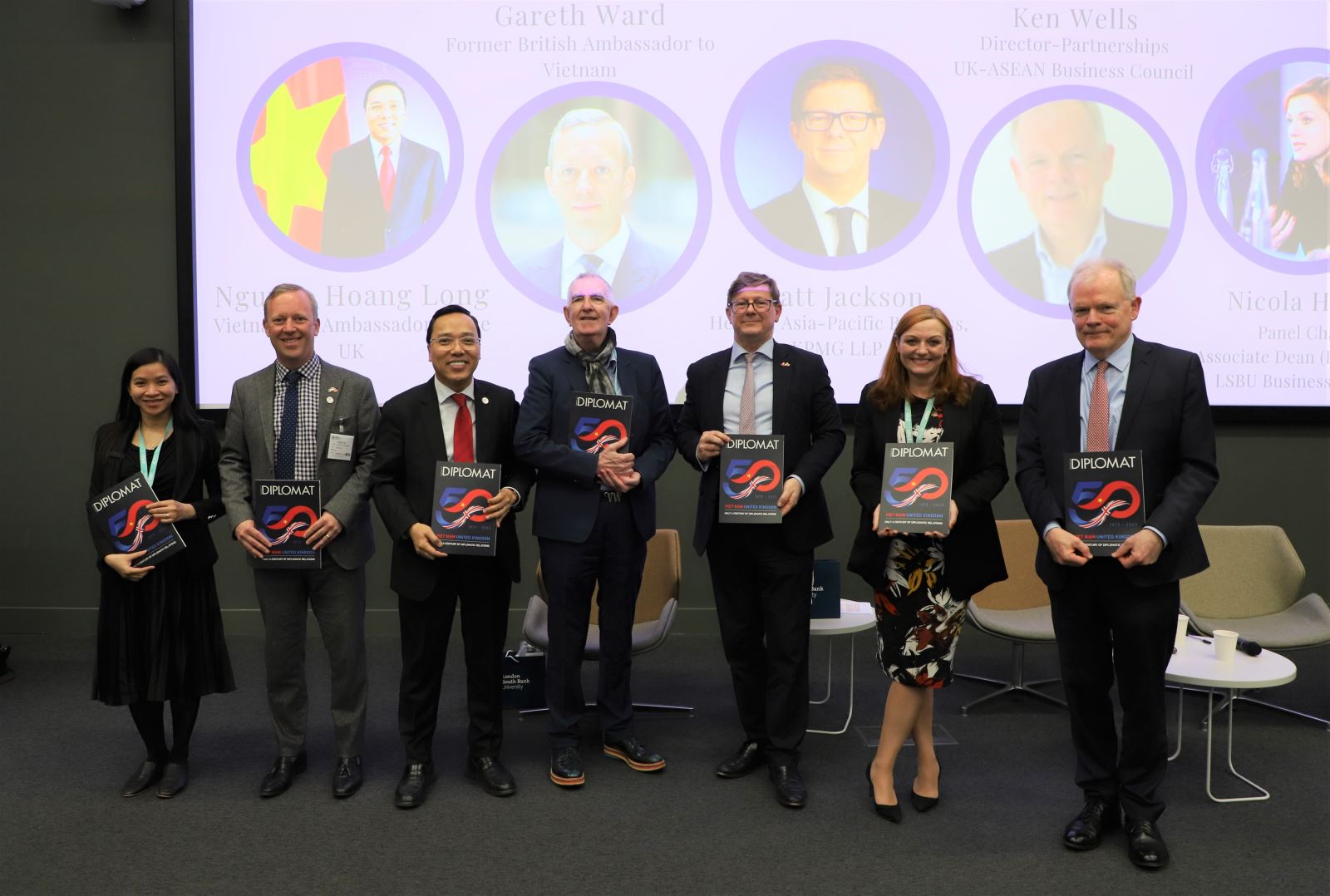 Professor Patrick Callaghan (middle) in a photo session with Vietnamese Ambassador to the UK Nguyen Hoang Long and other speakers at a workshop on Vietnam-UK economic ties in LSBU in April (Photo: VNA) |