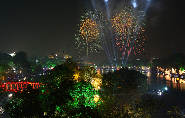 | Firework displays on Hoan Kiem Lake in Hanoi to welcome the New Year |