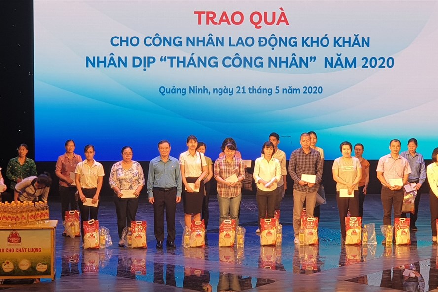 Workers are given gifts at a ceremony in Quang Ninh province on May 21, 2020, during Workers' Month. (Photo: laodong.vn) |