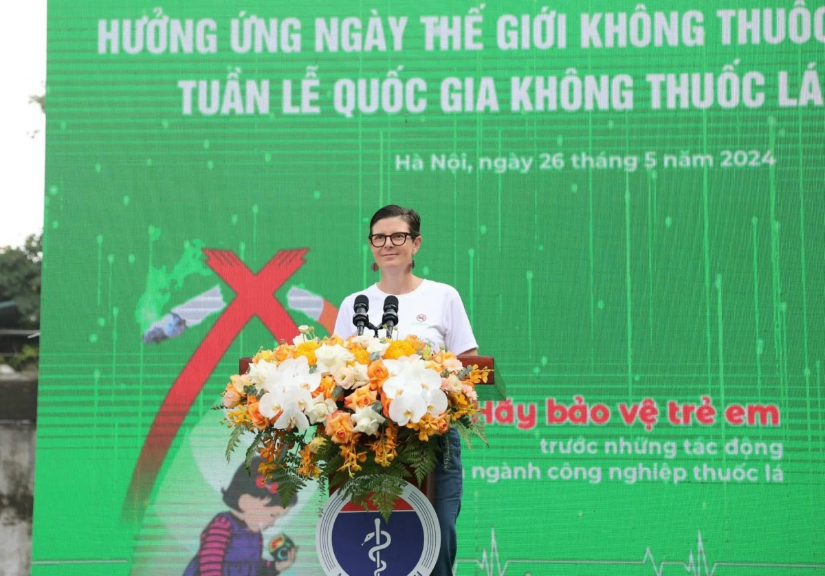 Dr. Angela Pratt, WHO Chief Representative in Vietnam, underscores the need to protect young people against the harmful effects of cigarettes of all types, at the Ministry of Health's a meeting in Hanoi on May 26 to mark World No Tobacco Day 2024 (May 31). (Photo: MoH) |