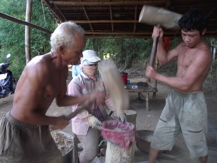 | Der 59-jährige Thach Miel (r.) zerstampft den jungen Klebreis. (Foto: VOVworld) |