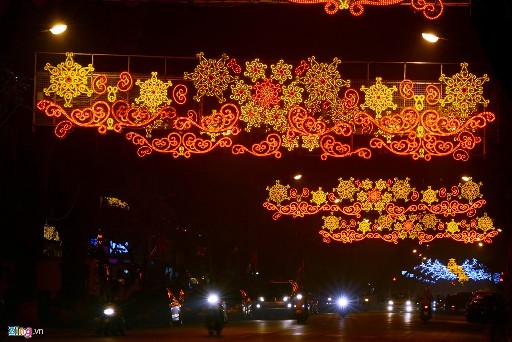 Alle Straßen in der Hauptstadt wurden mit bunten Blumen und Dekorationslampen geschmückt. Vor allem in der Nacht glänzen die Straßen. Bui Thi Hoa auf der Straße Hang Hom ist von dieser Bestimmung begeisgert: