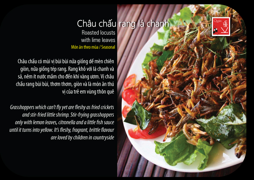 Grashüpfer gemeinsam mit Zitronenblättern geröstet, schwarze Spinnen mit Zitronengras gebraten, Seidenraupen mit Zwiebeln geröstet, u.s.w. Diese Gerichte sind nicht mehr fremd für Hanoier seit ein paar Jahren. Es gibt einige Restaurants, die Insekten-Gerichte anbieten.